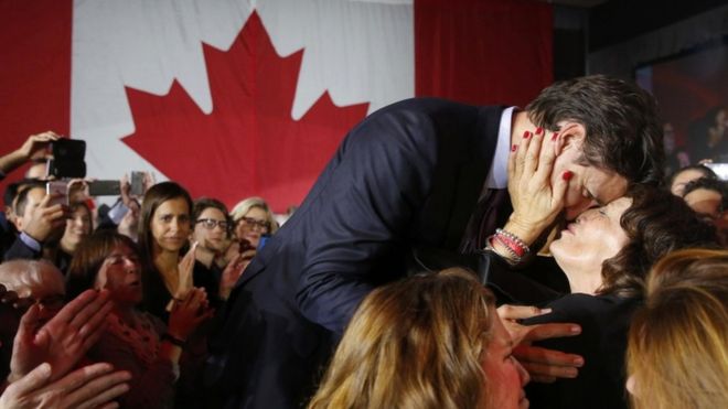 Justin Trudeau is congratulated by his mother Margaret after the Liberal victory